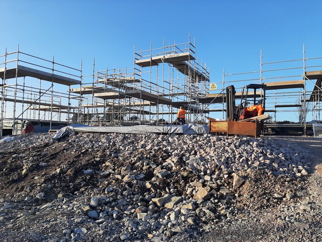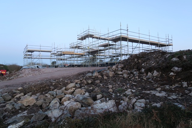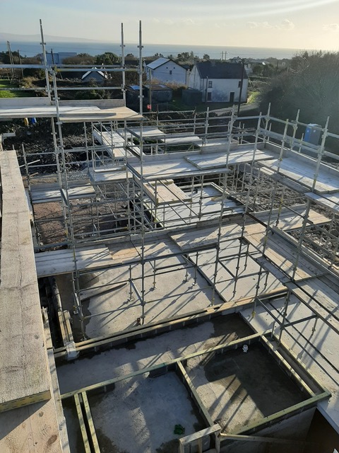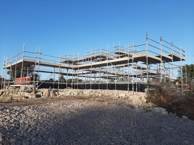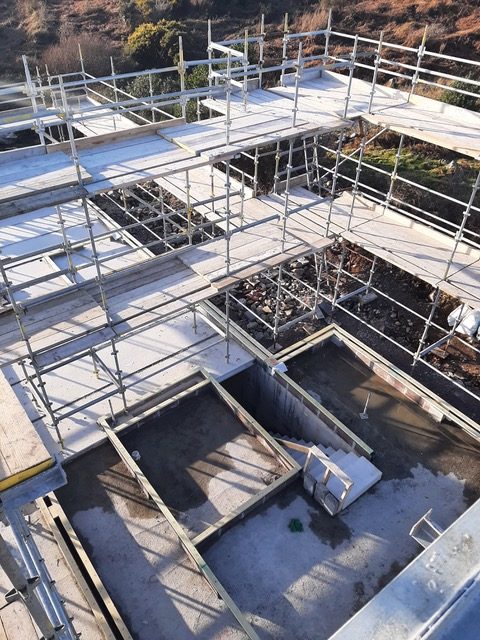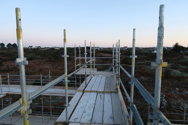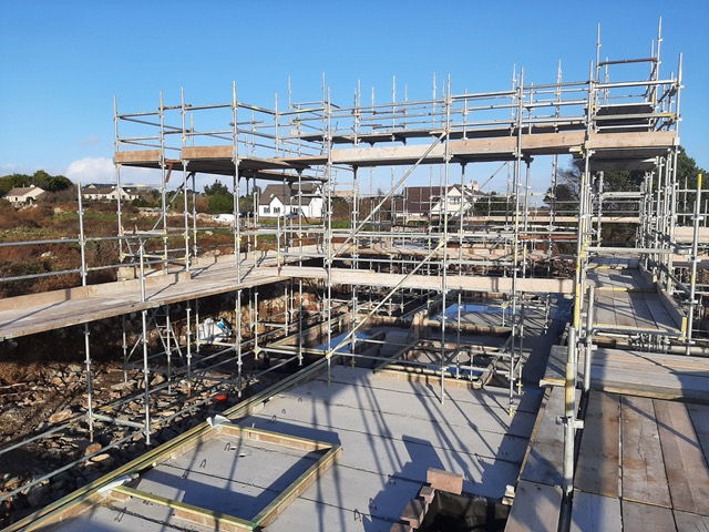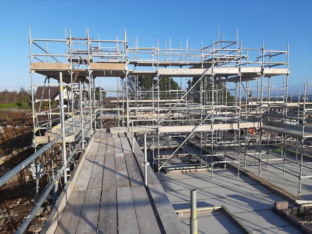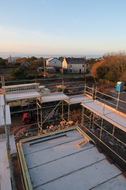 I really enjoyed the theatre the scaffolding created. It reminded me of an Escher drawing, beautifully layered with lines and light. It is so interesting as a spatial experience to climb up through the levels and walk around the edges. It’s not yet the spaces of our home, but it was such a delight to take in the temporary natureof these viewsand height. It brought us to the top level of the roof, this is the bird’s domain, a space we’ll never occupy, but it was quite lovely to have thatfleeting experience up in thesky. A big thanks to Kevin from Joyce Scaffolding from Lettermore, for making it happen, I know it wasn’t an easy job, so hats of to their skill for making a beautiful temporary piece of architecture. It was also great that we could use a local company from the Gaeltacht.