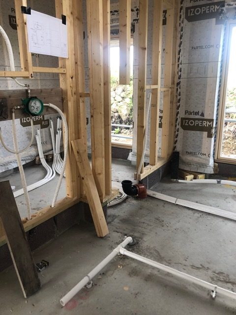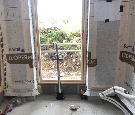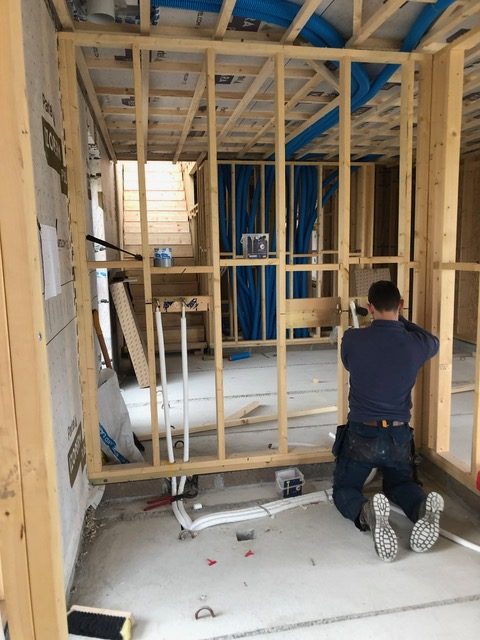 Once the plumbers land on site you need to be very specific on how your bathrooms will work. Exact positions of where to turn on the shower, the height of the rain dance head, bearing in mind the height of you and your other half. If you’re using inwall taps, you need to give the height above the basin and vanity units. Basically, anything hidden in the wall needs setting out and you need to have taps and mixers for the first fix. I produced 1:20 drawings of the bathrooms and stuck them to the wall. This reduced any ambiguity and the possibility of outdated drawings. During this stage I was on site every day to answer any questions. When you’re the main contractor, architect and client, this level of attention is required, it’s also probably easier for the plumber to deal with one person.