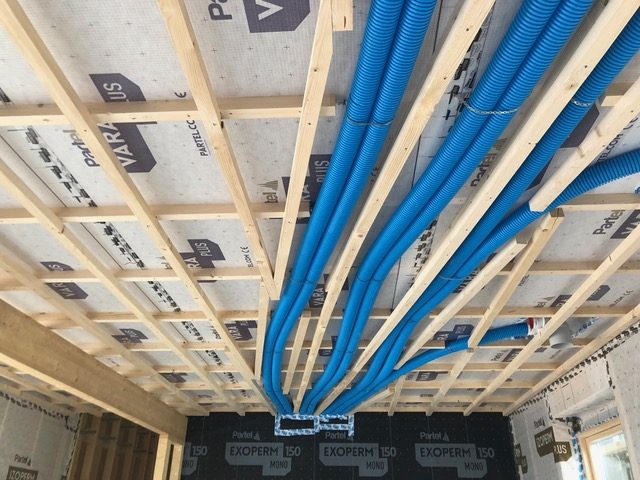 The ventilation runs required the same level of planning. The supply ducts were positioned to avoid been over beds and interfering with lighting layout. Bromur were happy to get this right on site. The team were conscious of our air tightness requirements and taped and sealed any cuts required in the membrane. Life on site is so much easier when you don’t have to chase people. Good trades are a blessing.