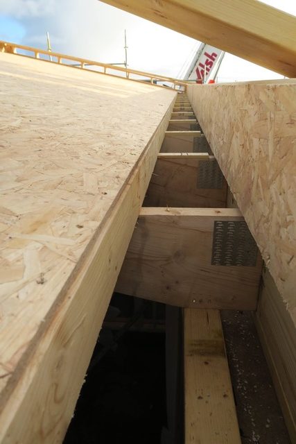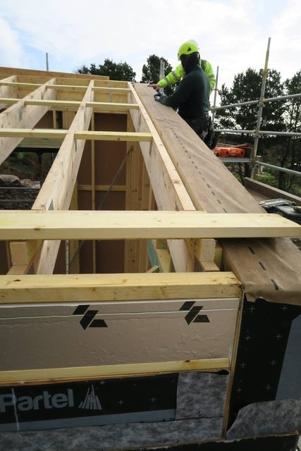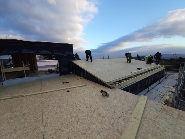 We now have rooms with a roof. Although the wall panels are trusses are made offsite, the trusses, decks, gutters and parapet need to be assembled and crafted onsite. Great care was taken by Irish ecohomes to get all the details right, from the falls in the gutter to the slope in the parapet, to the cold bridge insulation around the edge beam. The quality of work was really impressive.