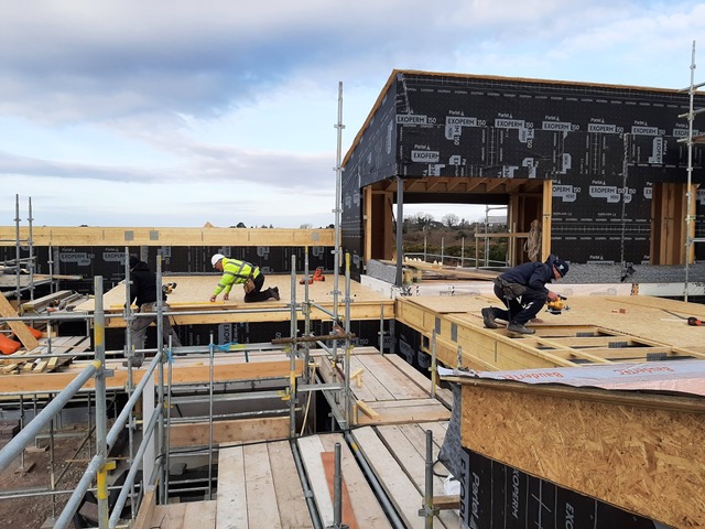 On Monday, all hands were literally on the roof deck to get it down before the bad weather closed in. There was a real sense of focus and team work. We have also been working hand in hand with Vertex roofing who are applying the Bauder membrane roof system. They have been brilliant getting lads onsite to install the first waterproofing layer (VCL) on the decks as soon as they were laid, this protects the timber and integrity of the deck from water. The drier the better for bonding the membrane. Vertex also use high-powered hot air to dry out the deck before it’s primed. A big thank you to the crew lead by Colin and the various Lee’s (Martin Lee, Lee McHugh and Lee onsite). The conditions were not friendly to say the least, the easterly winds were cutting through me, and I was only briefly on the roof. It was a relief yesterday to see all the roof decks installed and waterproofed, I was definitely nervous about this coordination point.
