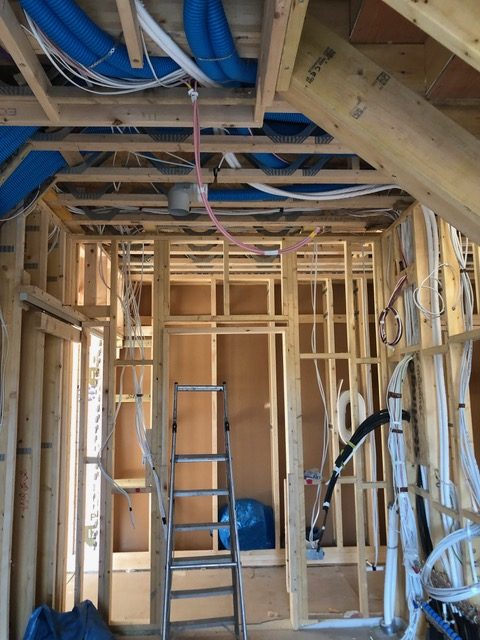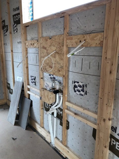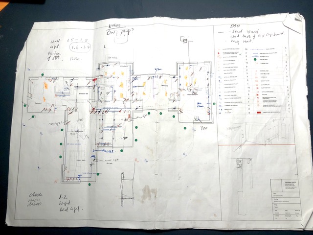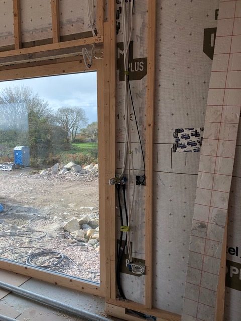 We appointed Oliver Mullen Electrical, and I worked with James for the first fix, he’s a great electrician and gave very practical advice. I printed an A1 layout for their reference on site and walked through each room and marked all the sockets and switches and rationalised the layout further.  James was very patient with moving pendants and lights to get the position just right. Another consideration is setting the height of plugs and switches and wall lights. Then there is long list of other services that need a location from security, wi-fi, data points, thermostats, ventilation boosters, isolators, 2-way switches, electric blinds, external lights/sockets, sensors, drivers for led strips, earth rods etc. There’s a lot to consider.