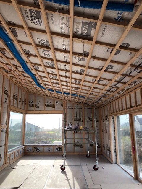 Building regulations require houses to have a score of 5 m3/hr/m2. This is not a great score in terms of air tightness. A passive house is well below 1 m3/hr/m2 or 0.6 ach. We have designed our house with the guidance of passive house principles. Achieving a low air tightness score takes planning from the beginning, we handed over this part of the build to @Irishecohomes. A multi-layered strategy is required to achieve a continuous airtightness layer and excellent workmanship and attention to detail is needed. Use of the cellulose insulation also improves air-tightness, as it creates a continuous thermal jacket without joints.