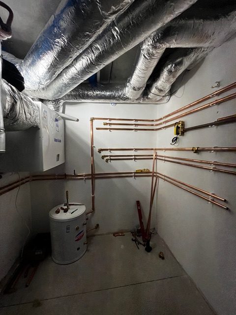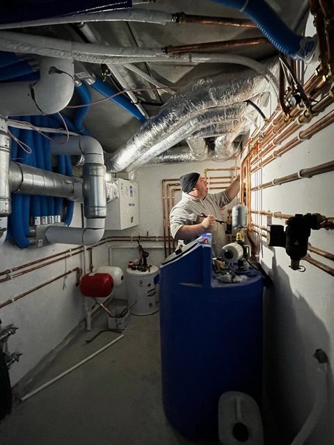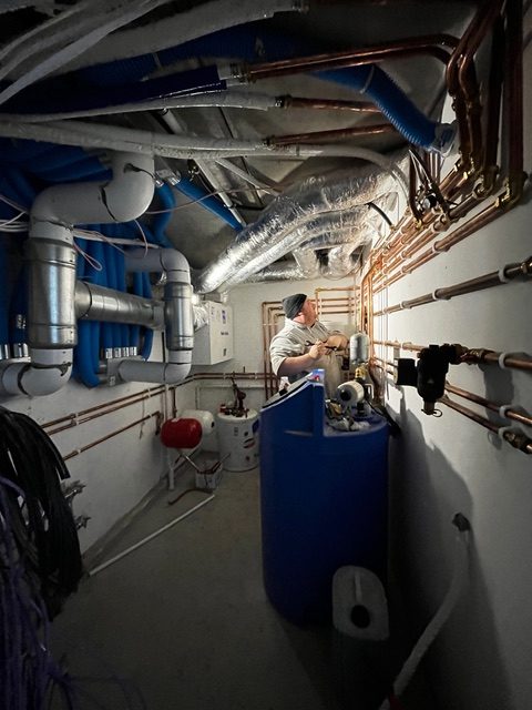 The cold water coming in from the mains, fills up the blue storage water tank, this is usually located in most people’s attics. We have a submergible pump to give the desired pressure and a bypass value if we have a power cut. The plantroom is a translation of the heating diagrams and systems into 3D. I really appreciated that our plumber Dave from Bromur took such pride in his work, ensuring equal spacing between pipes, there is such joy in order! It looks like an underground map following all the routes from the water source to their final destination to keep us clean.