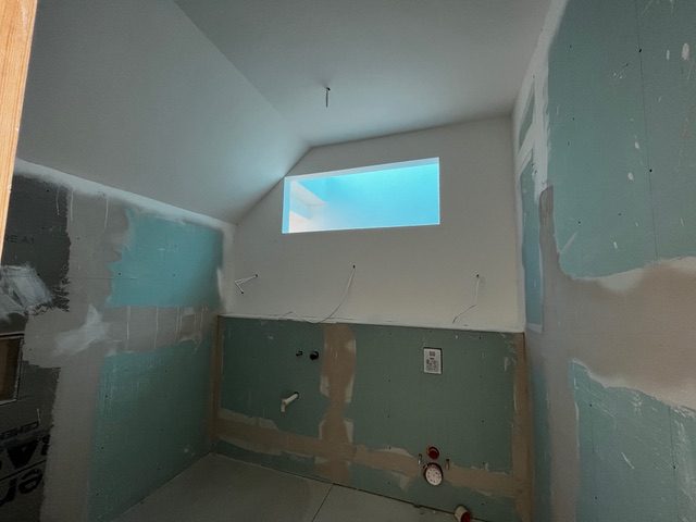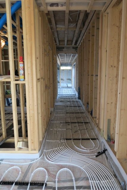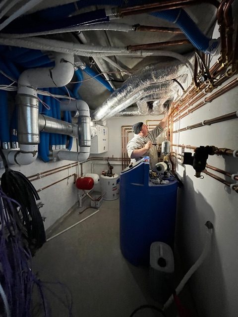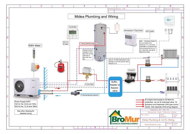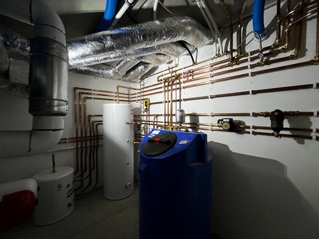We have a Midea monobloc heat recovery unit that sits outside and generates heat in a slightly magical heat exchange process. This heats a hot water tank internally which supplies water for showers and underfloor heating.