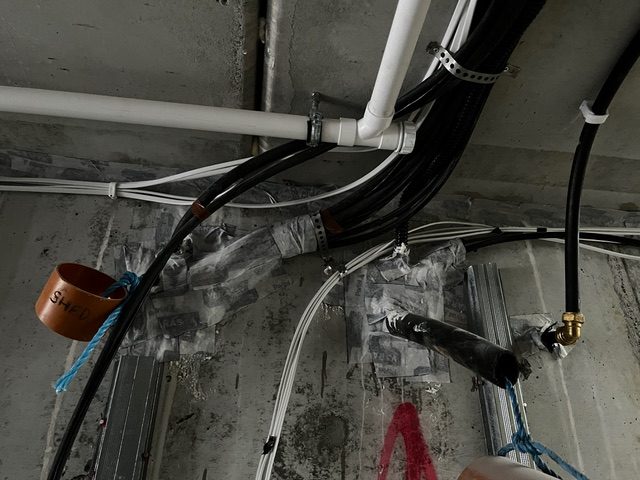 The blue pipes are the supply and extract pipes for our heat recovery ventilation system. These are connected to the outside through the separate supply and extract pipes insulated to prevent any condensation forming. This ventilation system is needed as we have an extremely airtight house.