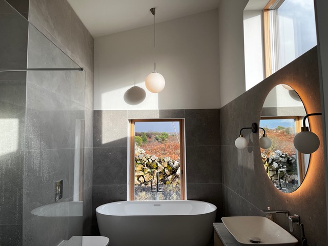 There is also some lunar inspiration with the surface of the tiles and light fittings, I tell Iarlaith the lights are planets, moons and a solar eclipse, seeing the moon through the high-level window makes it even more resonant. Simple lighting worked best for this calm room and we also added dimmer switches which is a nice feature for a bathroom. After years of renting, it’s very satisfying to have a beautifully formed room to feel new in every day. Bathrooms are hard work to get right, it’s not just about the sanitary ware or tiles, they are most successful when the architecture makes the space for the activities, a window with a view for the bath, high level window centred above the mirror and well placed and controlled lighting.