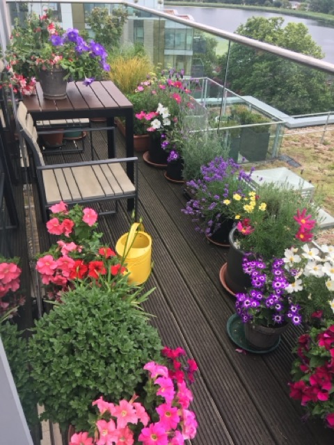 Cian made the planter box last September from timber sleepers, we treated them with bitumen paint on the inside and insecticide on the outside and then painted with an outdoor furniture paint. We put large stones in the base and sheets of cardboard, then filled with 3 tonnes of topsoil. Once I had finished the planting, I covered the top layer with composted bark to give a nice clean finish and inhibit the growth of weeds.