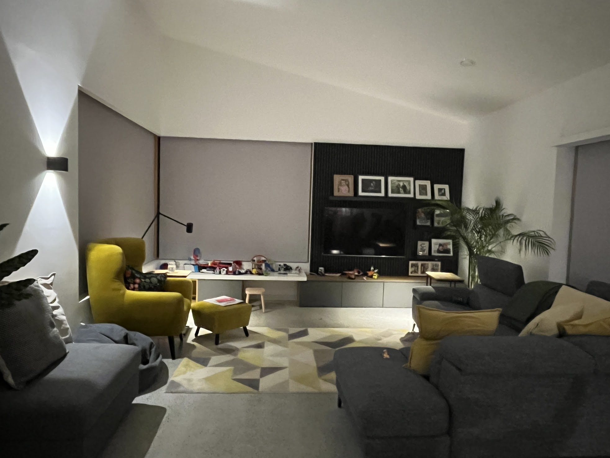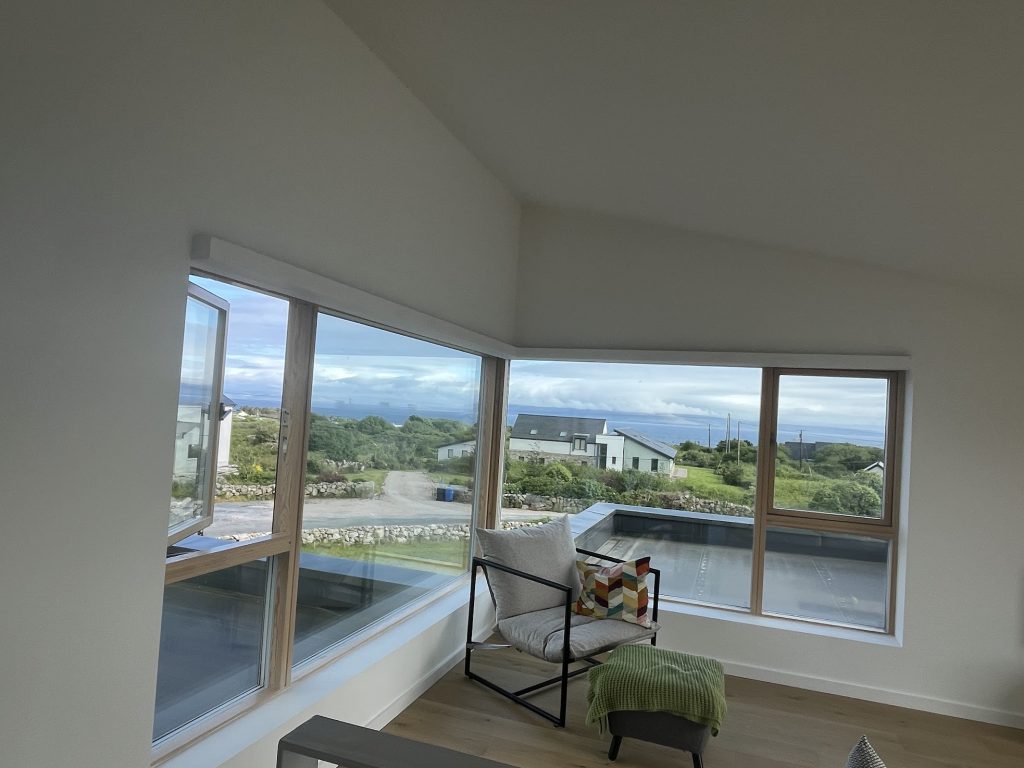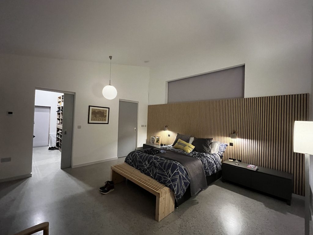 Blinds are the eyelids of our home, integrated and essential for rest. We thought about hidden blinds at the outset of the project. Our timber frame company stepped up the structure to allow space for the blind, we built out the recess for blinds in timber battens, slabbed around recess with plasterboard and then skimmed and paint, we wired all the big windows for electric blinds and finally Apollo Blinds made the blinds to measure and fitted.