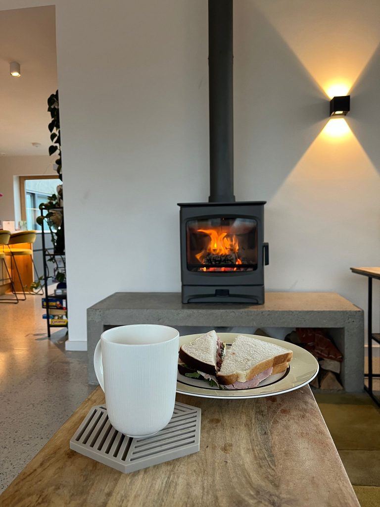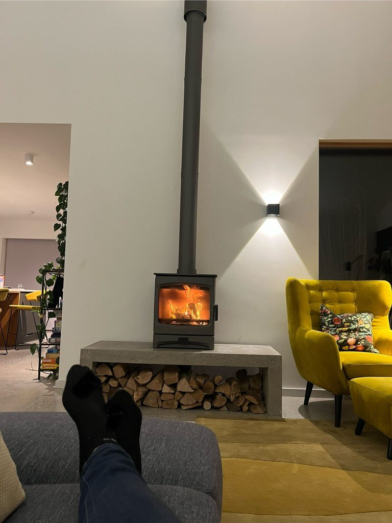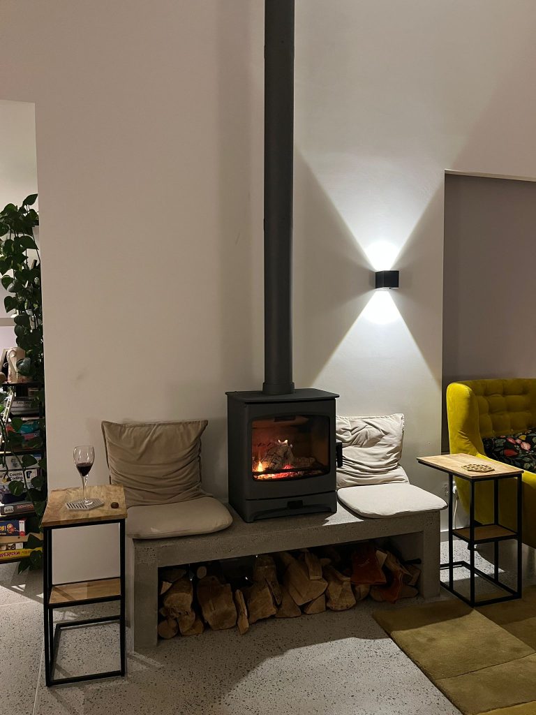 The stove was purchased from @murphyheating Kinvara and Senje did a great job of the installation. It’s a Charnwood Aire 7 in Gunmetal grey, wood burning stove. The size of the room can easily accommodate the fire without been overpowering, the heating temperature rises to 22-23 degrees, so comfortable and cosy. The concrete bench was crafted by Cian to match our polished concrete floor. It’s designed to have a seat either side, so you can sit up to the heath of the fire, like the old traditional open hearths.
